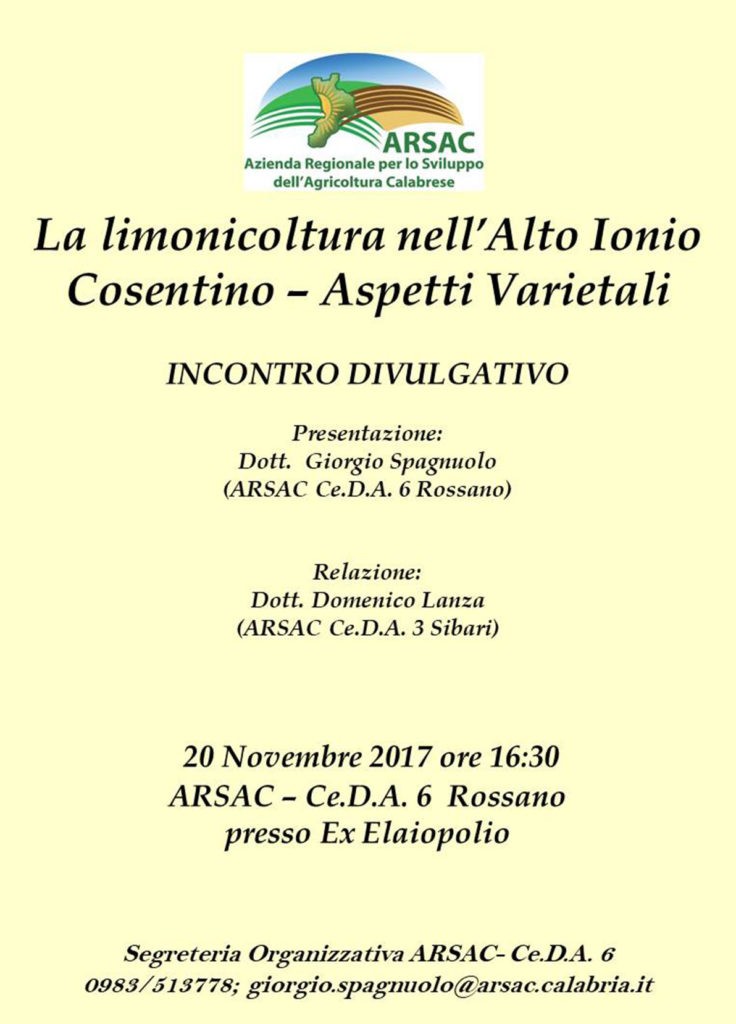 Lunedi 20 novembre alle ore 16.30 , presso il centro divulgazione n. 6  di Rossano,  si terrà un incontro  divulgativo, organizzato dall’ARSAC,  riguardante la limonicoltura nell’Alto Ionio Cosentino – aspetti varietali e agronomici.
