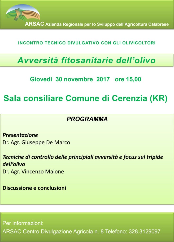 Giovedì 30 novembre alle ore 15.00 , presso la Sala consiliare Comune di Cerenzia (KR), si terrà un incontro tecnico divulgativo, organizzato dall’ARSAC, riguardante le avversità fitosanitarie dell’olivo.