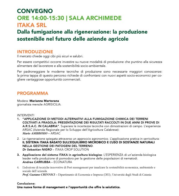 All’interno della cornice di FRUTECH 2025, l’ARSAC è stata invitata a partecipare al convegno tecnico organizzato da ITAKA dal titolo “Dalla fumigazione alla rigenerazione: la produzione sostenibile nel futuro delle aziende agricole”.