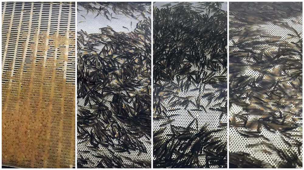 Per facilitare tale operazione, con l’ausilio di una piuma, delicatamente, si è proceduto ad amalgamare il tutto con l’aggiunta di poca acqua proveniente dalla stessa sorgente dove saranno poste le uova. Dopo circa 10-15 minuti di riposo, durante i quali è avvenuta l’attivazione delle uova, esse sono state lavate e poste su appositi setacci immersi nell’acqua corrente proveniente dalla nostra sorgente aziendale. Le femmine riproduttrici, che in questa prima fase non avevano rilasciato le uova, sono state successivamente fecondate dopo circa 25 giorni. Quotidianamente, per circa due mesi, l’operaio addetto all’impianto, servendosi di una piuma ed una pinzetta, provvede ad allontanare dall’intera massa, le uova non fecondate, che risultano facilmente riconoscibili perché di colore bianco.