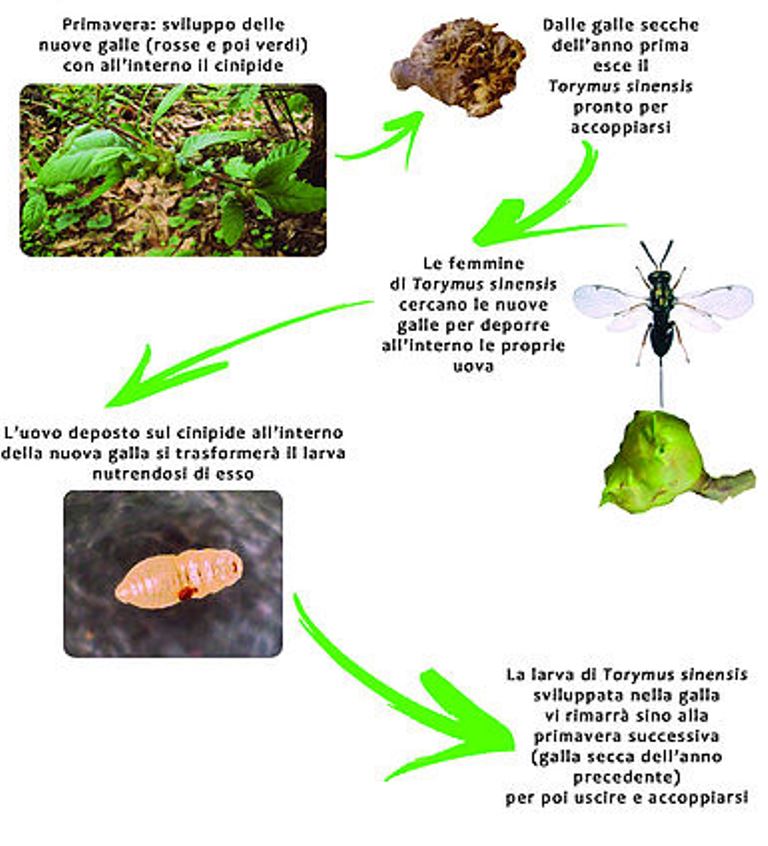- non distruggere il fogliame a terra ed i residui di potatura prima della fine di maggio (del 2 anno dalla loro caduta) in quanto si asporterebbero anche le uova e larve dell’insetto utile utilizzato nella lotta biologica; infatti il sinensis, e altri parassitoidi autoctoni, svernano nelle galle dove hanno ucciso e larve del cinipide e ne escono da adulte sfarfallando durante la primavera successiva;