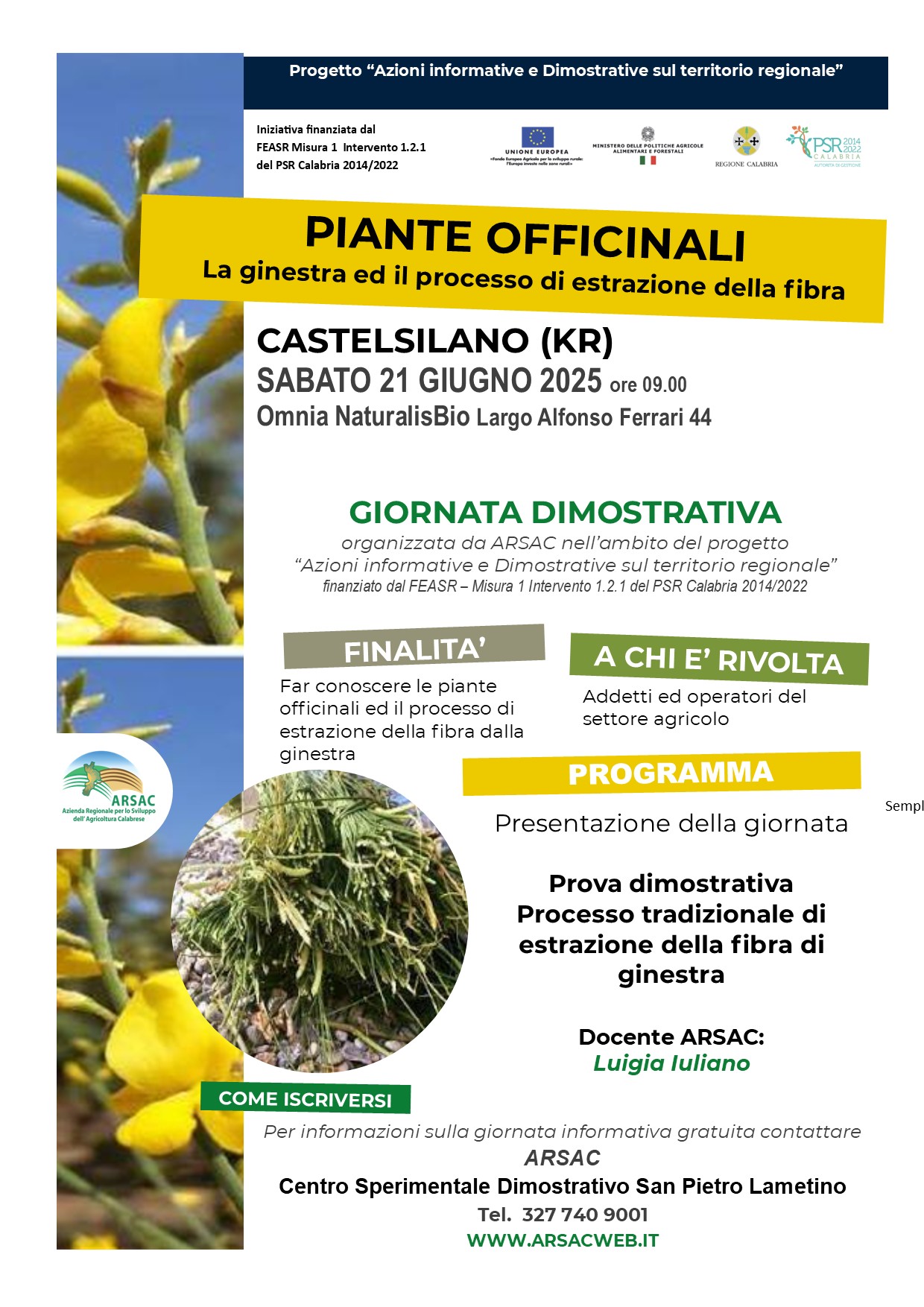 Nell’ambito del progetto “Azioni informative e dimostrative sul territorio regionale”, finanziato dal FEASR – Misura 1 Intervento 1.2.1 del PSR Calabria 2014/2022, l’ARSAC (Azienda Regionale per lo Sviluppo dell’Agricoltura Calabrese) organizza una serie di giornate informative e dimostrative dedicate alle piante officinali e alla tessitura, antiche tradizioni profondamente radicate nella cultura e nell’economia rurale calabrese.