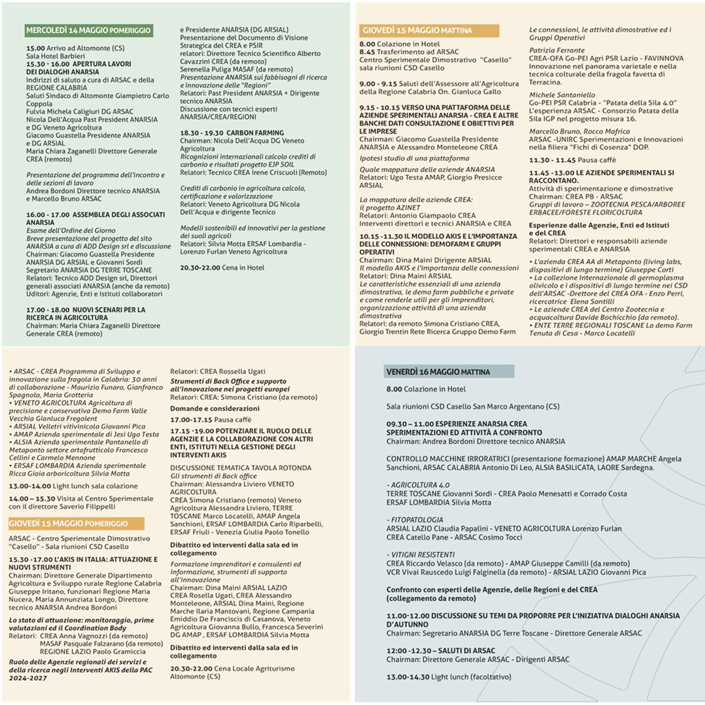 All’iniziativa, che conferma il ruolo centrale della Calabria nel panorama agricolo nazionale, parteciperanno il Direttore Generale del CREA Maria Chiara Zaganelli, il Direttore Tecnico-Scientifico del CREA Alberto Cavazzini, il direttore del CREA OFA di Rende Enzo Perri, Serenella Puliga e Pasquale Falzarano del Ministero delle Politiche Agricole, Alimentari e Forestali, il Direttore del Dipartimento Agricoltura e sviluppo Rurale della Regione Calabria Giuseppe Iiritano, Giacomo Guastella Direttore Generale di ARIAL Lazio, Nicola Dell’Acqua Direttore Generale di Veneto Agricoltura, Giovanni Sordi Direttore Generale Terre Toscane, Francesca Severini Direttore Generale AMAP delle Marche, i dirigenti e i funzionari di ALSIA Basilicata, della Regione Puglia, della Regione Campania, dell’ARSAC e della regione Calabria, dell’ARSIAL Lazio e Regione Lazio, dell’ ARSARP Molise, della Regione Marche, della Regione Liguria, di Veneto Agricoltura, dell’ ERSA Friuli Venezia Giulia, dell’ERSAF Lombardia, dell’Agenzia LAORE della Sardegna e i ricercatori del CREA.