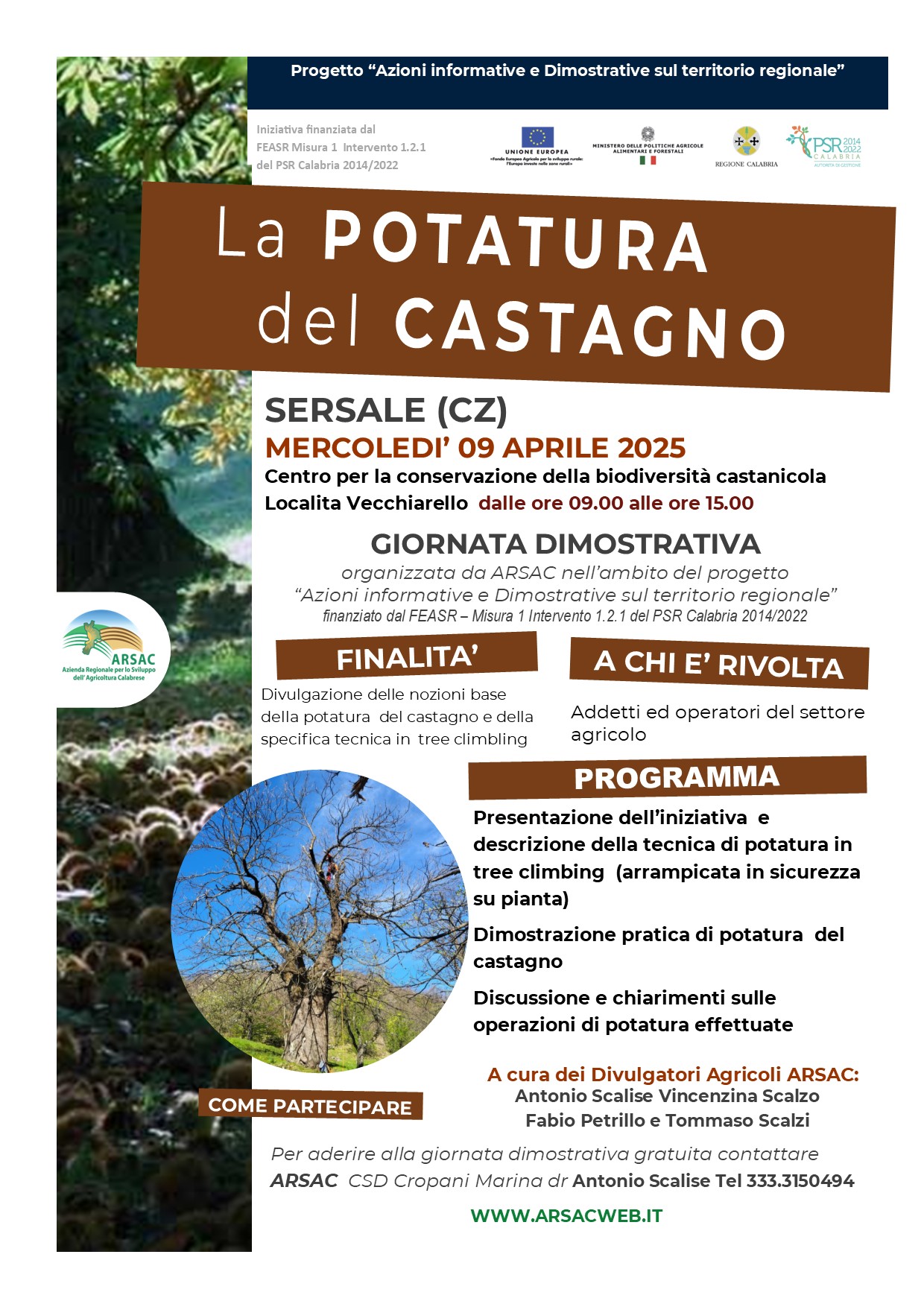 L’ARSAC, nell’ambito del progetto “Azioni informative e dimostrative sul territorio regionale” finanziato dal FEASR – Misura 1 Intervento 1.2.1 del PSR Calabria 2014/2022, organizza una serie di giornate dimostrative dedicate alla divulgazione delle nozioni base della potatura del castagno e alla specifica tecnica di tree climbing (arrampicata in sicurezza su pianta).