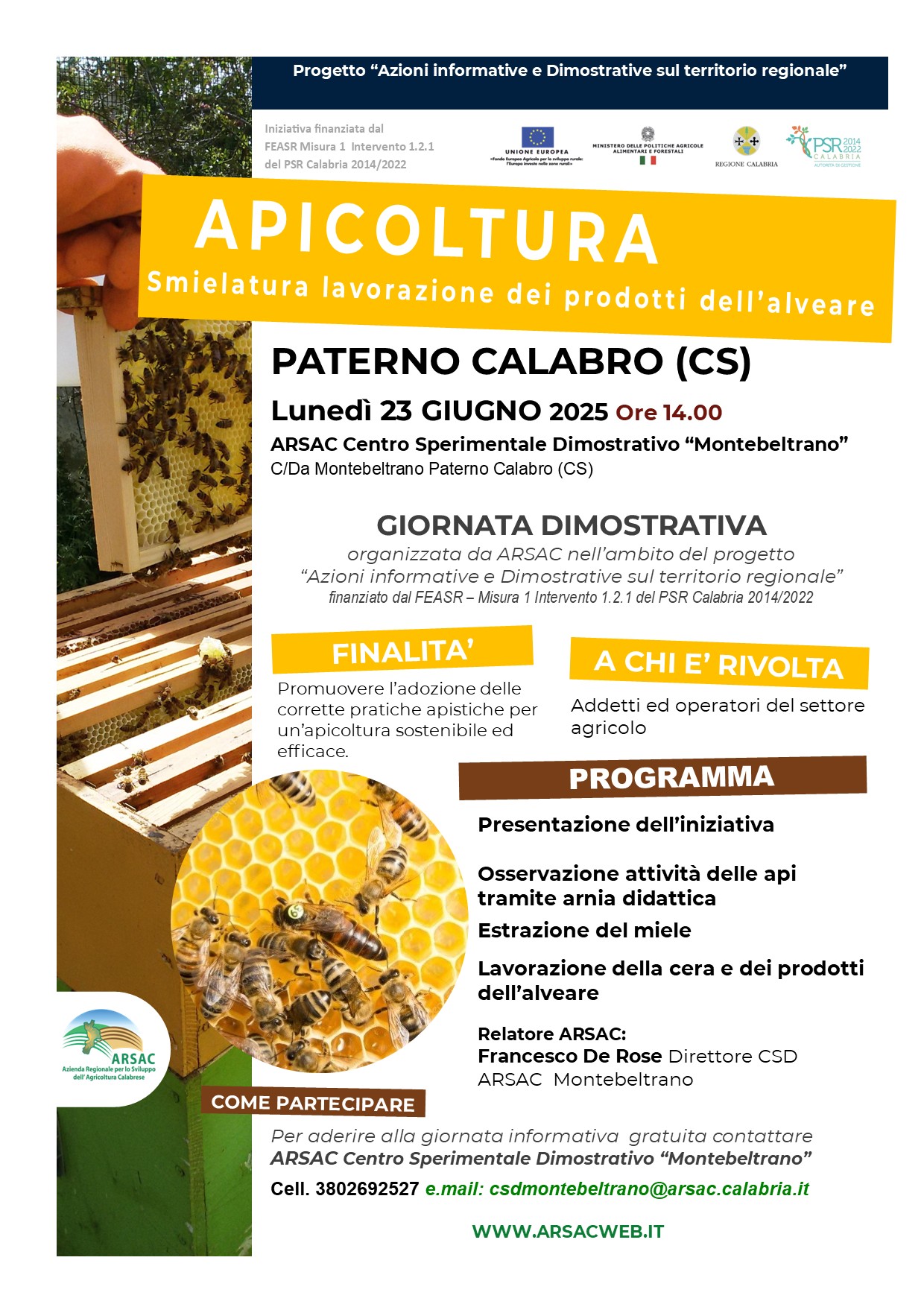 L’ARSAC, nell’ambito del progetto “Azioni informative e dimostrative sul territorio regionale”, finanziato dal FEASR – Misura 1, Intervento 1.2.1 del PSR Calabria 2014/2022, promuove una serie di giornate informative e dimostrative dedicate all’apicoltura, alla gestione dell’alveare e alle più recenti innovazioni del settore.