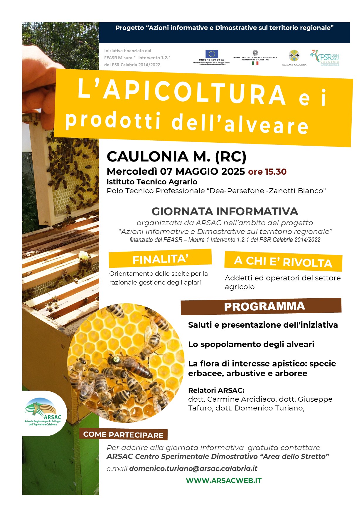 L’ARSAC, nell’ambito del progetto “Azioni informative e dimostrative sul territorio regionale”, finanziato dal FEASR – Misura 1, Intervento 1.2.1 del PSR Calabria 2014/2022, promuove una serie di giornate informative e dimostrative dedicate all’apicoltura, alla gestione dell’alveare e alle più recenti innovazioni del settore.