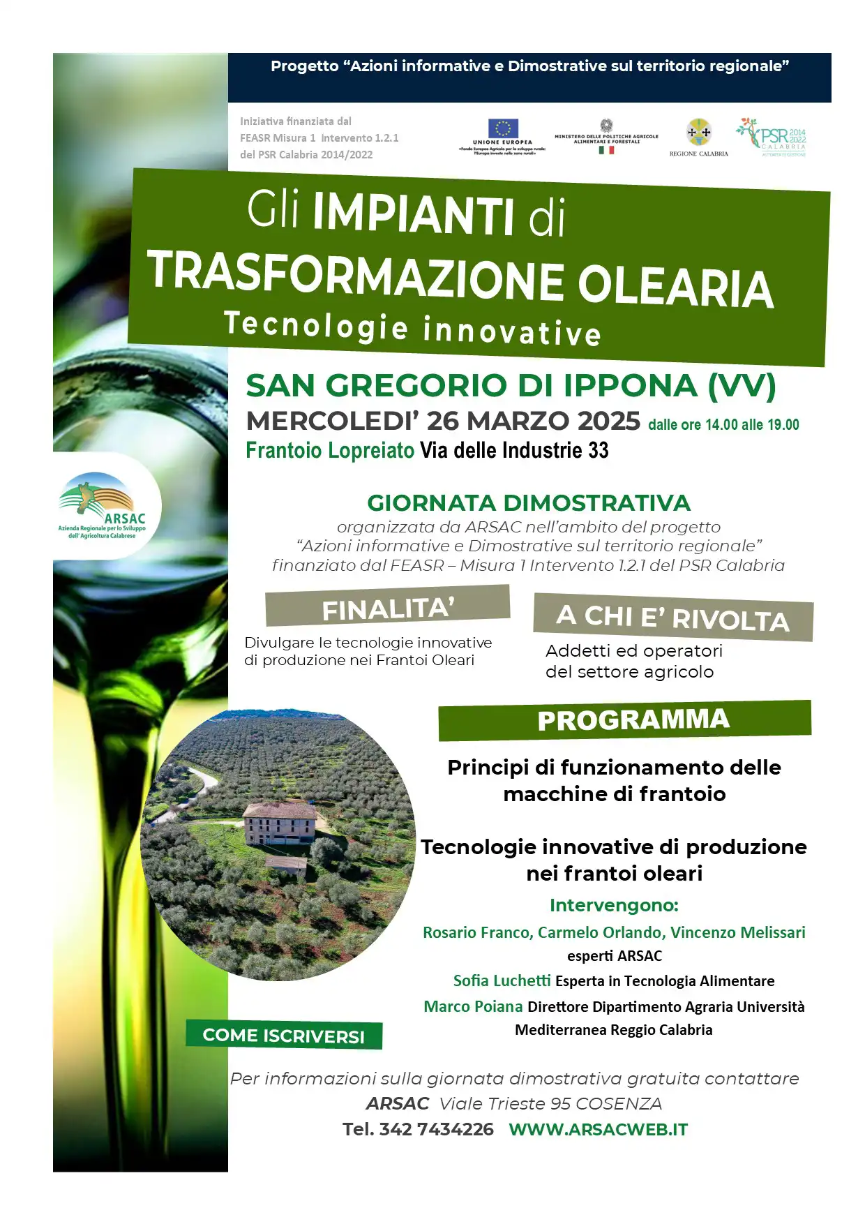L’ARSAC, nell’ambito del progetto “Azioni informative e dimostrative sul territorio regionale” finanziato dal FEASR – Misura 1 Intervento 1.2.1 del PSR Calabria 2014/2022, organizza una serie di giornate dimostrative dedicate agli impianti di trasformazione olearia e alle tecnologie innovative impiegate nel settore.
