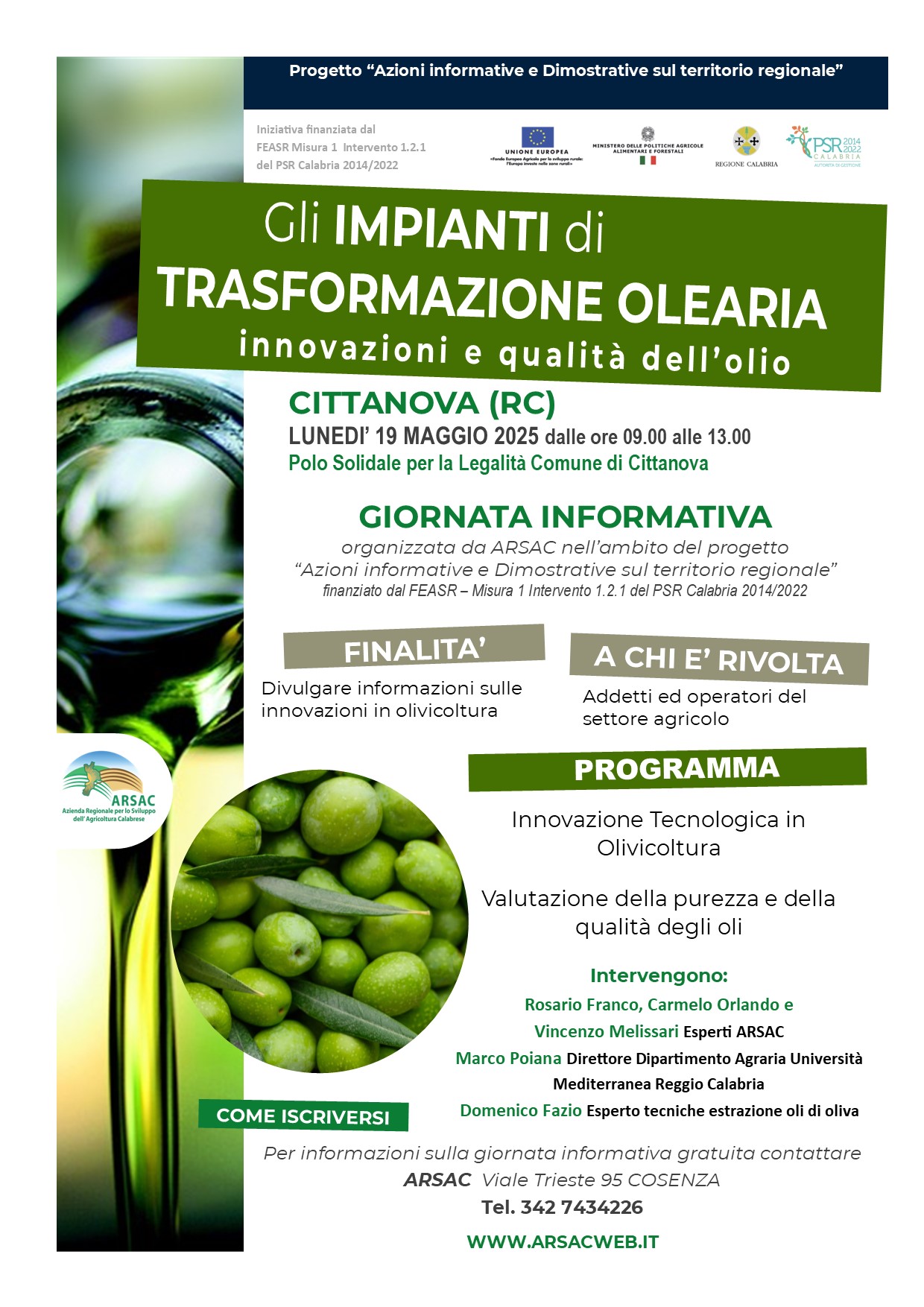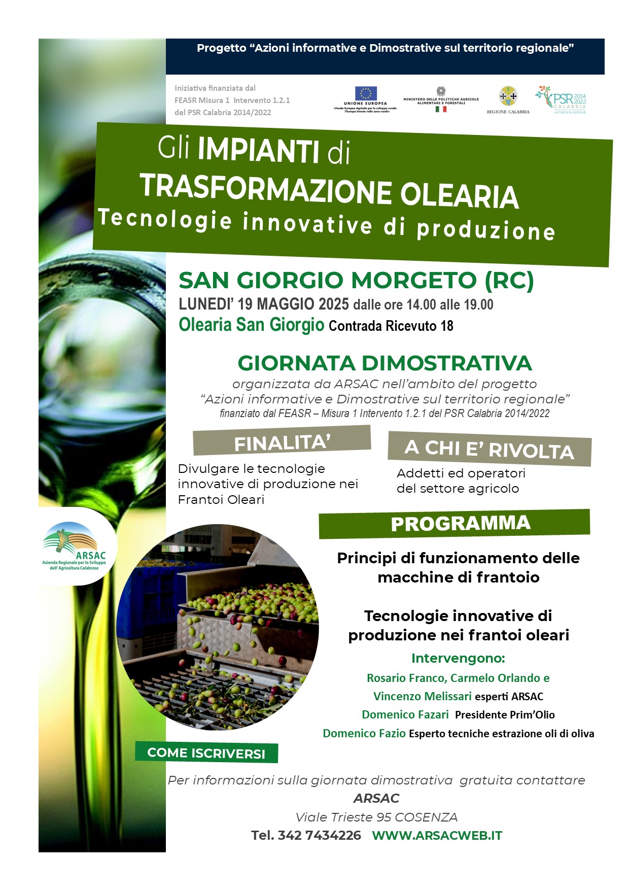 L’ARSAC, nell’ambito del progetto “Azioni informative e dimostrative sul territorio regionale” finanziato dal FEASR – Misura 1 Intervento 1.2.1 del PSR Calabria 2014/2022, organizza una serie di giornate Informative e Dimostrative dedicate agli impianti di trasformazione olearia, con un focus su innovazioni e qualità dell’olio.