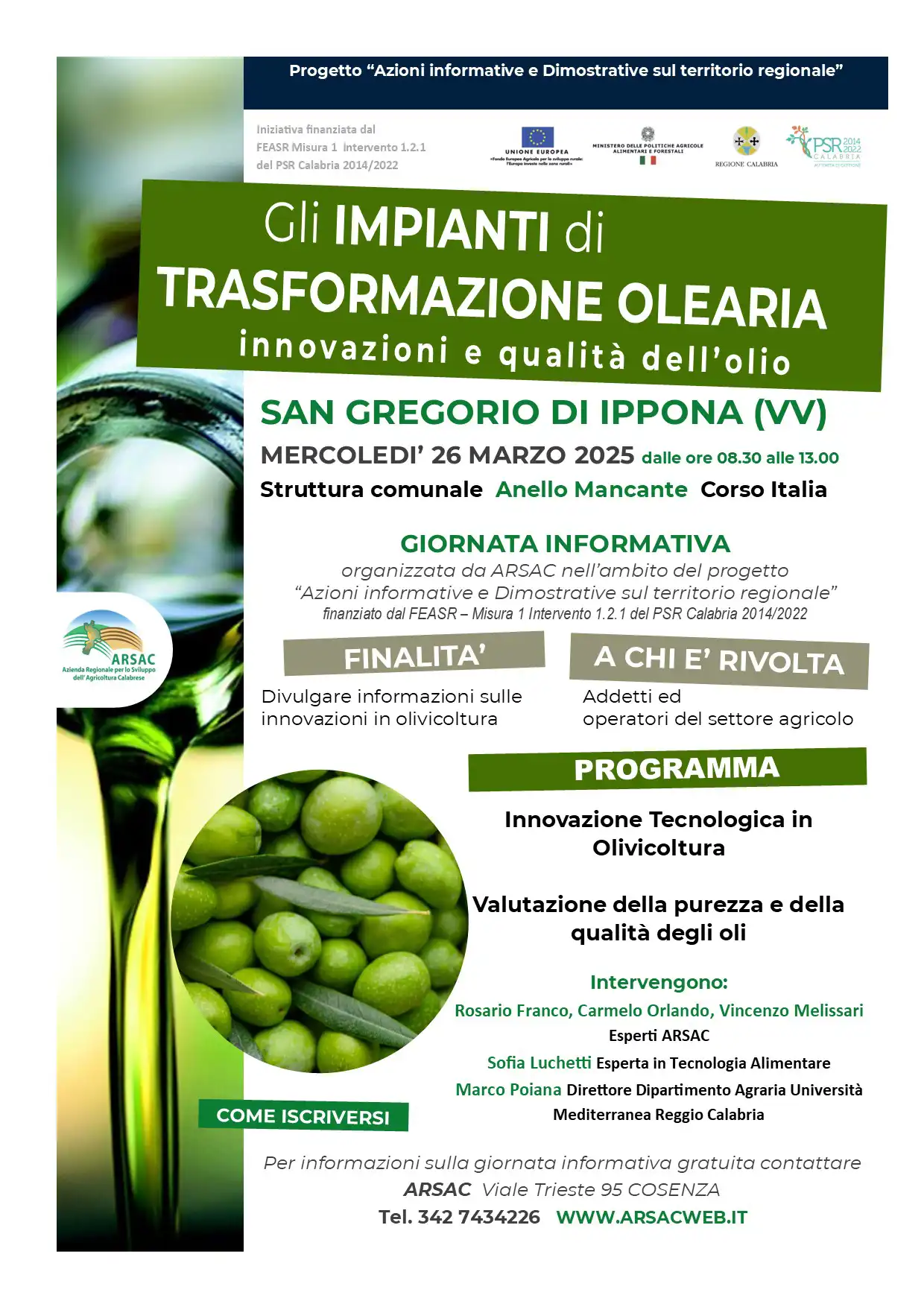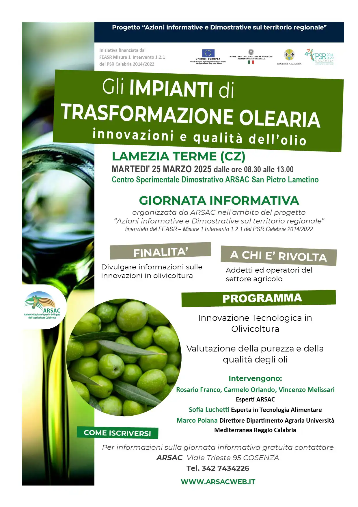 L’ARSAC, nell’ambito del progetto “Azioni informative e dimostrative sul territorio regionale” finanziato dal FEASR – Misura 1 Intervento 1.2.1 del PSR Calabria 2014/2022, organizza una serie di giornate informative dedicata agli impianti di trasformazione olearia, con un focus su innovazioni e qualità dell’olio.