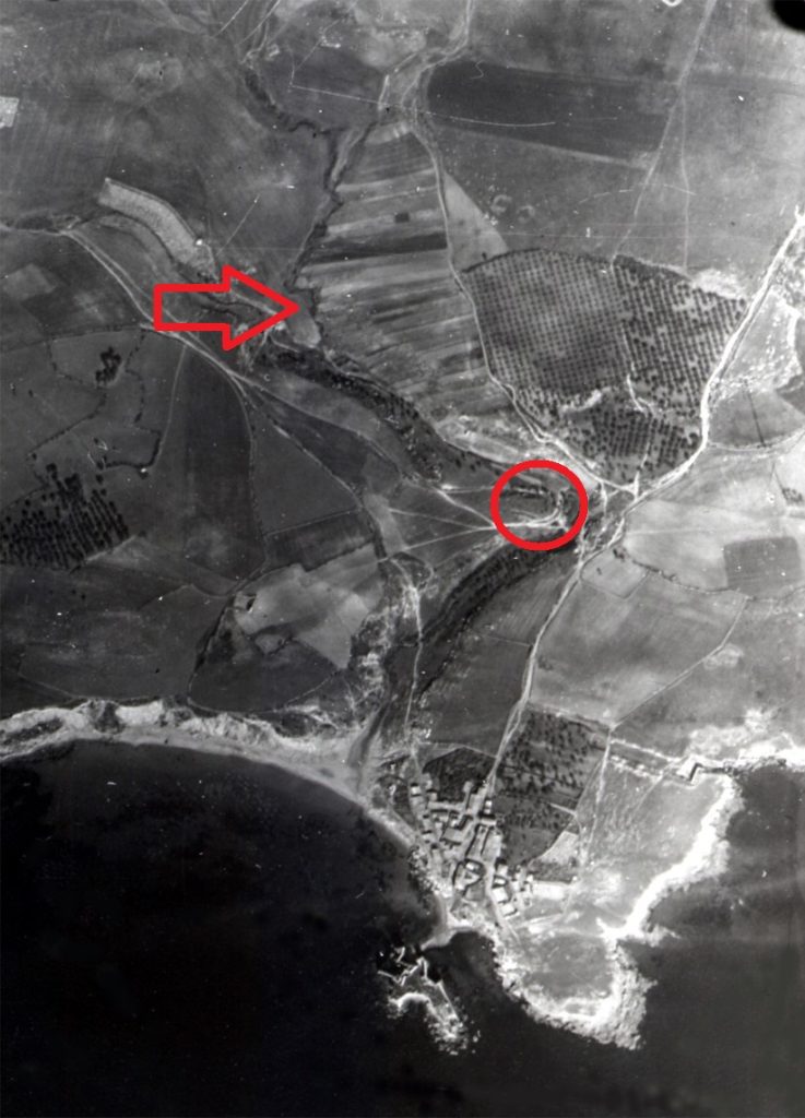 Le Castella di Isola Capo Rizzuto (KR), fotopiano IGM del 1943. In evidenza l’area dove permane il toponimo “S. Giovanni” e, indicate dalla freccia, le strisce attraverso cui si conservano i segni dell’antico appezzamento relativo all’esistenza del vigneto.
