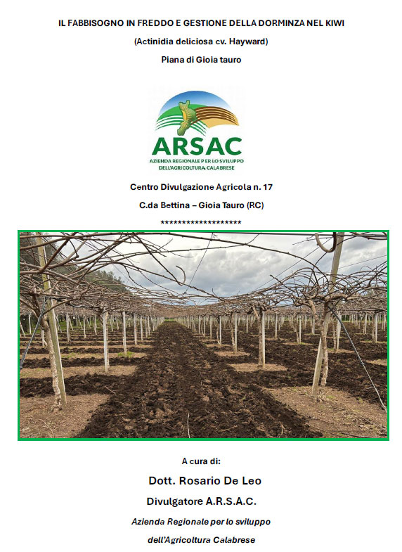 È stato pubblicato l’opuscolo divulgativo “Il fabbisogno in freddo e la gestione della dormienza nel kiwi (Actinidia deliciosa cv. Hayward)”, a cura del dott. Rosario De Leo, divulgatore agricolo di ARSAC.