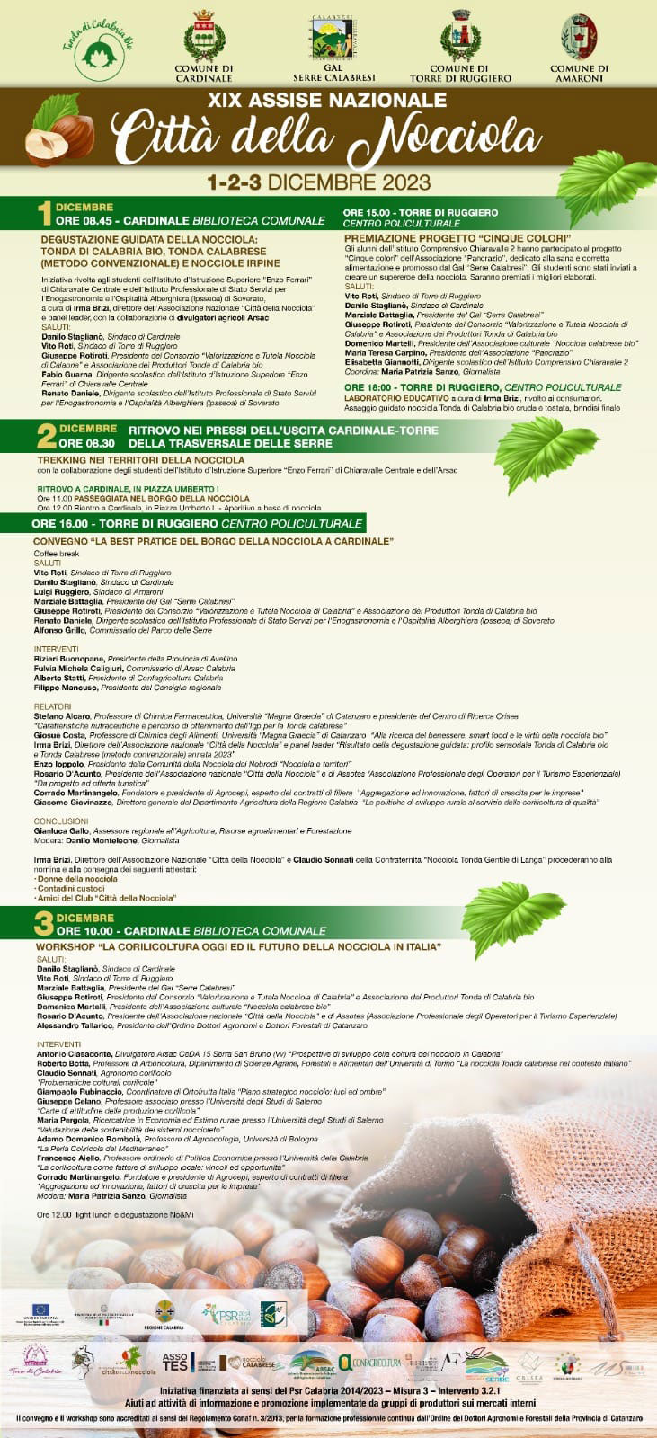 L’evento, organizzato dell’Associazione Nazionale “Città della Nocciola” in collaborazione con i Comuni di Cardinale e Torre Ruggiero, il consorzio Nocciola di Calabria, l’ATS Tonda di Calabria Bio, il GAL Serre Calbresi, l’Arsac tramite il Centro Divulgazione Agricola di Serra San Bruno ed il Parco Regionale delle Serre, si svolgerà nei giorni 1, 2 e 3 dicembre 2023.