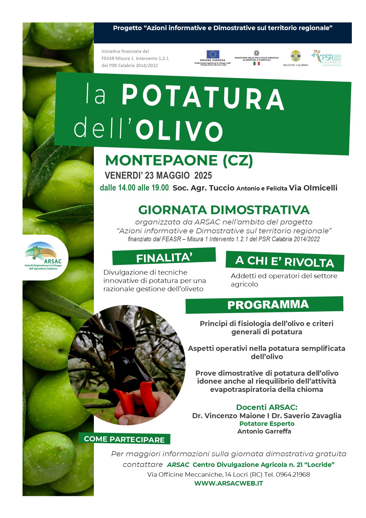 L’ARSAC, nell’ambito del progetto “Azioni informative e dimostrative sul territorio regionale” finanziato dal FEASR – Misura 1 Intervento 1.2.1 del PSR Calabria 2014/2022, organizza una serie di giornate dimostrative dedicate alla divulgazione di tecniche innovative di potatura per una razionale gestione dell’oliveto.