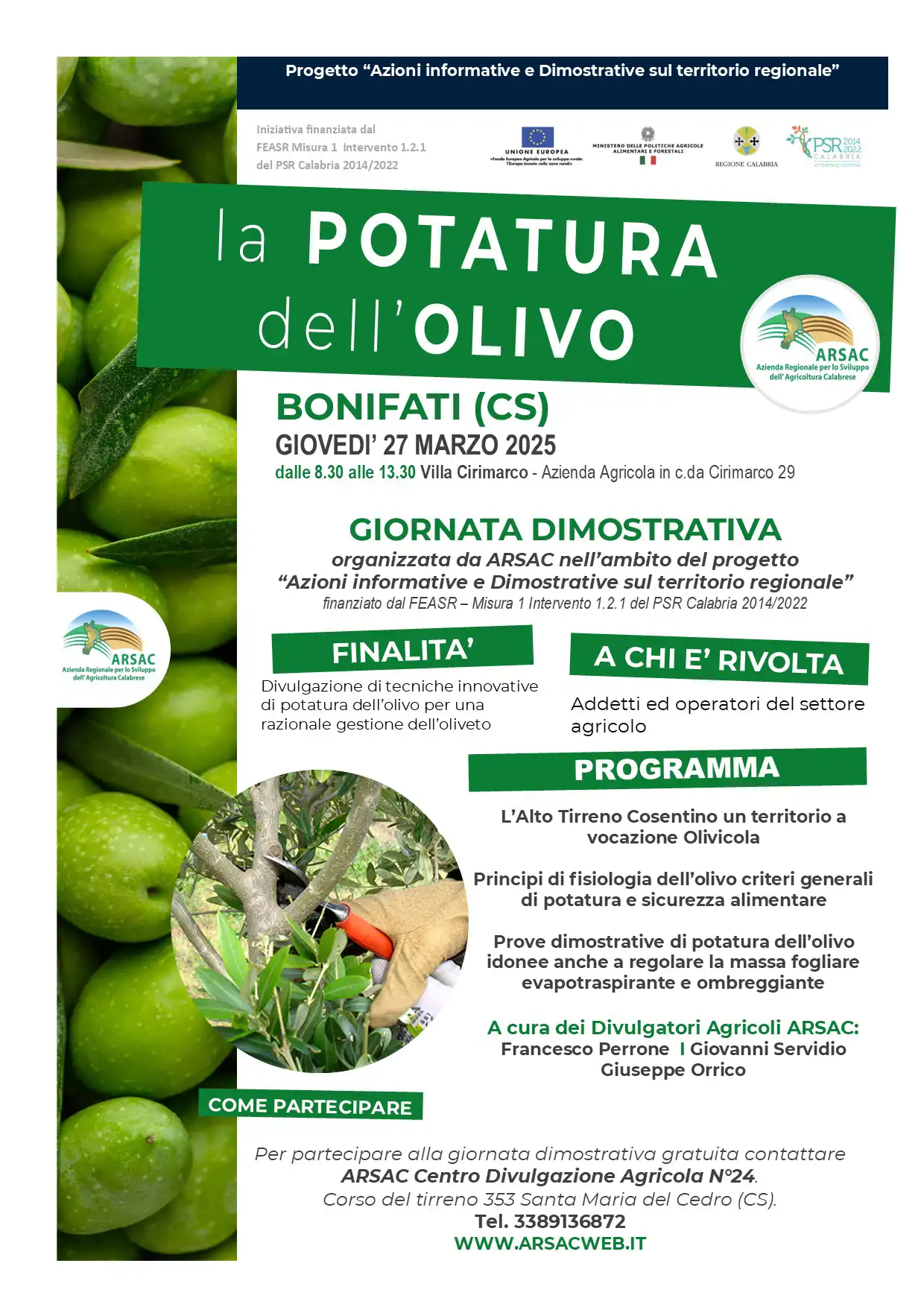 L’ARSAC, nell’ambito del progetto “Azioni informative e dimostrative sul territorio regionale” finanziato dal FEASR – Misura 1 Intervento 1.2.1 del PSR Calabria 2014/2022, organizza una serie di giornate dimostrative dedicate alla divulgazione di tecniche innovative di potatura per una razionale gestione dell’oliveto