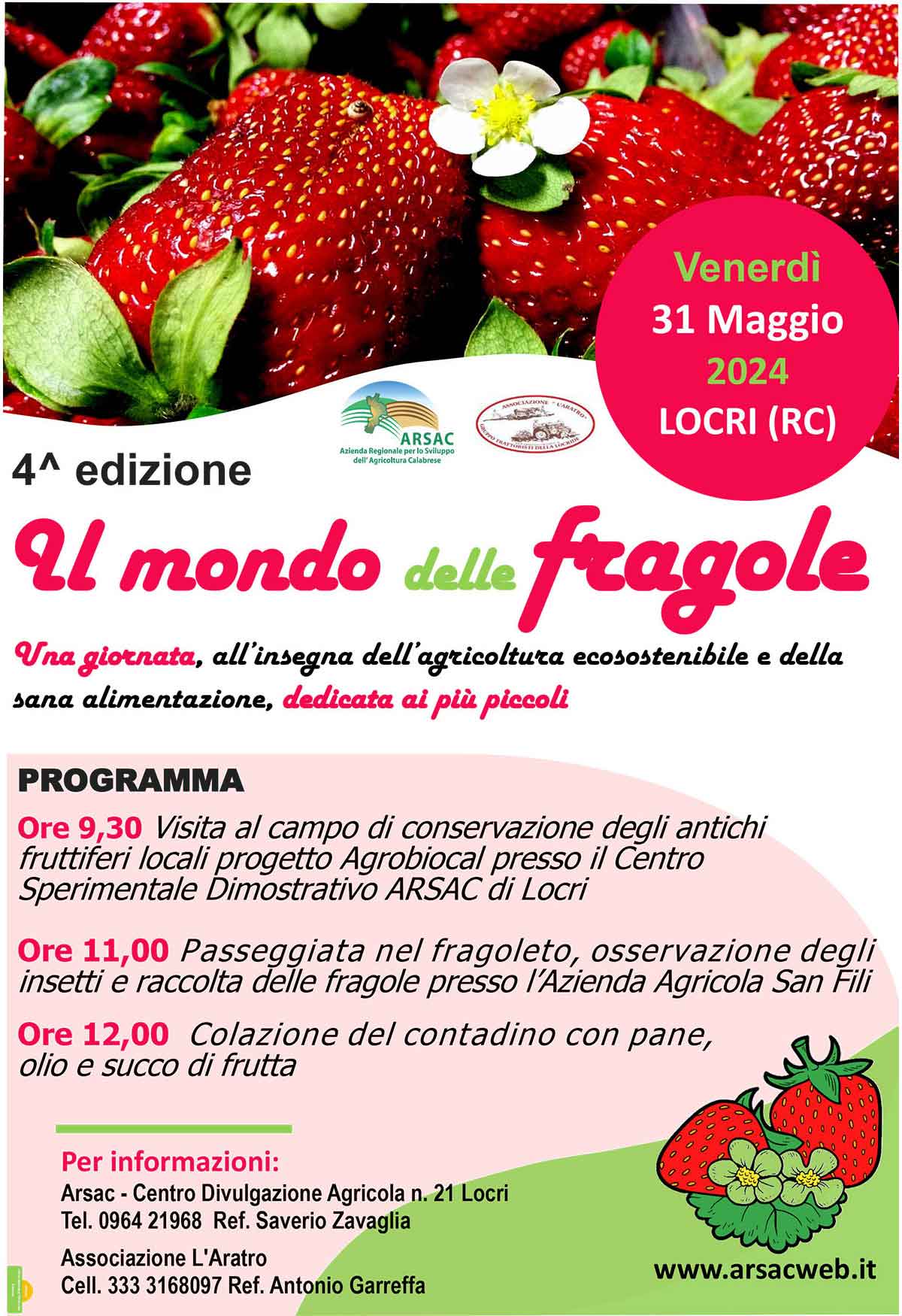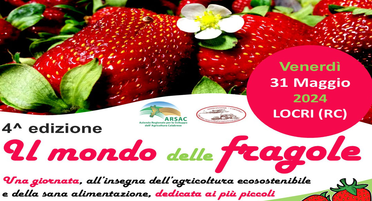 Venerdì 31 maggio si svolgerà a Locri (RC) la IV^ edizione della manifestazione “Il mondo delle fragole” giornata dedicata agli alunni delle scuole primarie del comprensorio ricca di divertimento, apprendimento e, naturalmente, tantissime fragole.