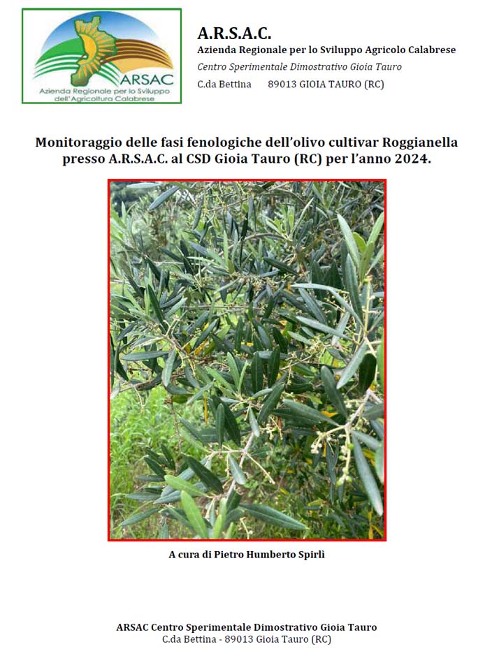 Pubblicato l’opuscolo divulgativo Monitoraggio delle fasi fenologiche dell’olivo cultivar Roggianella presso A.R.S.A.C. al CSD Gioia Tauro (RC) per l’anno 2024.