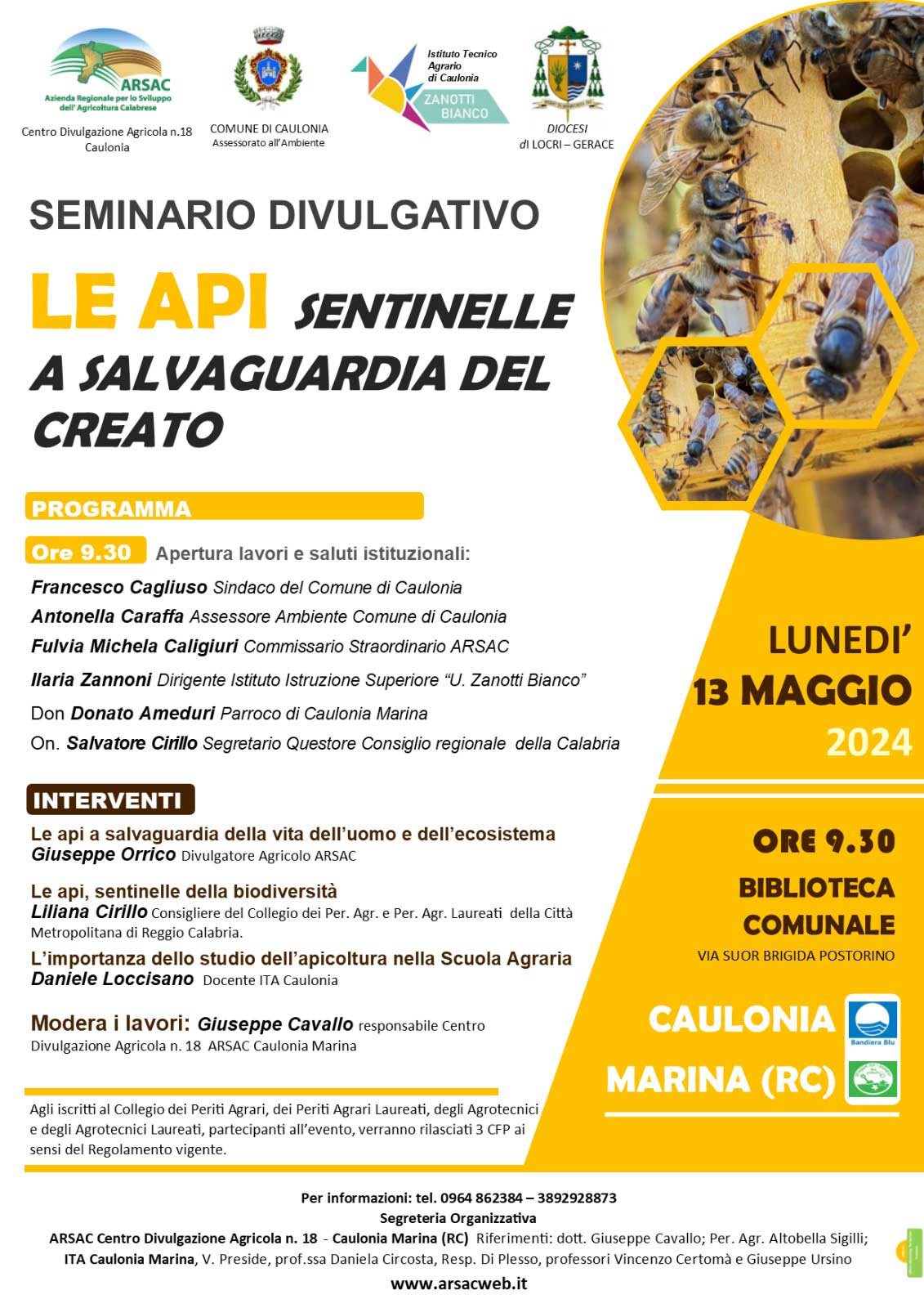 Lunedì 13 Maggio a partire dalle ore 9.30, presso la Biblioteca Comunale di Caulonia Marina (RC), si terrà il seminario divulgativo “Le api, sentinelle a salvaguardia del Creato”