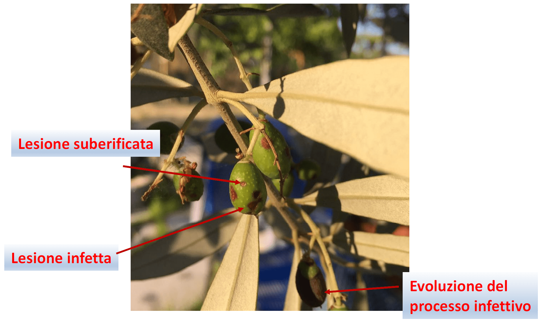 Le modificazioni climatiche hanno indubbiamente influito sulla biocenosi dell’agroecosistema oliveto, favorendo, alcuni fitofagi e la proliferazione di numerose patologie fungine come: Occhio di pavone, Spilocaea oleagina (Cast.) Hugh; Cercosporiosi o piombatura, Mycocentrospora cladosporioides; Rogna o tubercolosi, Pseudomonas syringae pv. Savastanoi; Lebbra, Colletotrichum gloesporioides (Penzig).